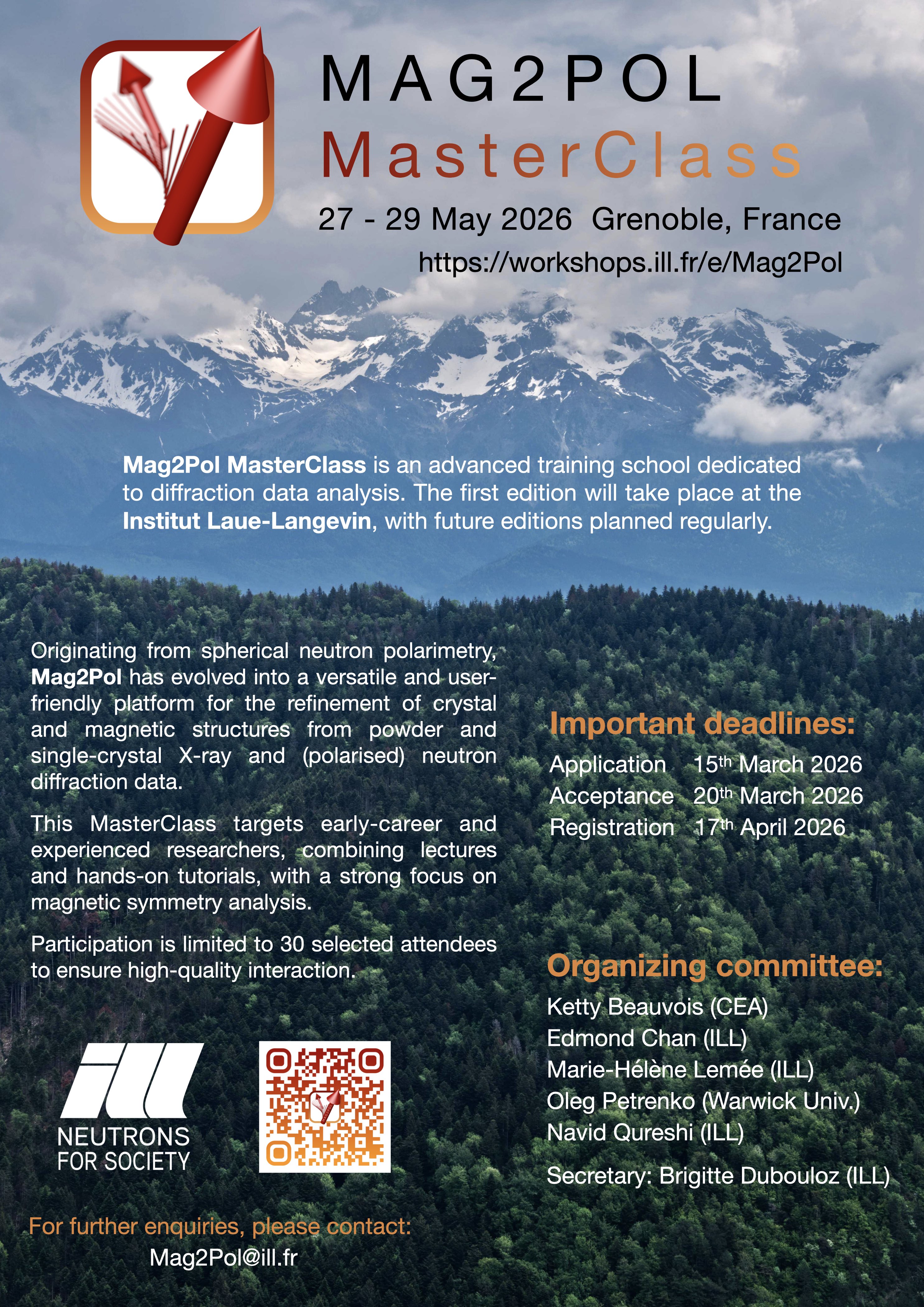 The MasterClass will take place 27–29 May 2026 at the Institut Laue-Langevin (ILL) in Grenoble, France. It is aimed at both early-career and experienced researchers, and will combine focused lectures with hands-on tutorials. Particular emphasis will be placed on magnetic structure determination and symmetry analysis using Mag2Pol <http://www.ill.fr/mag2pol>.